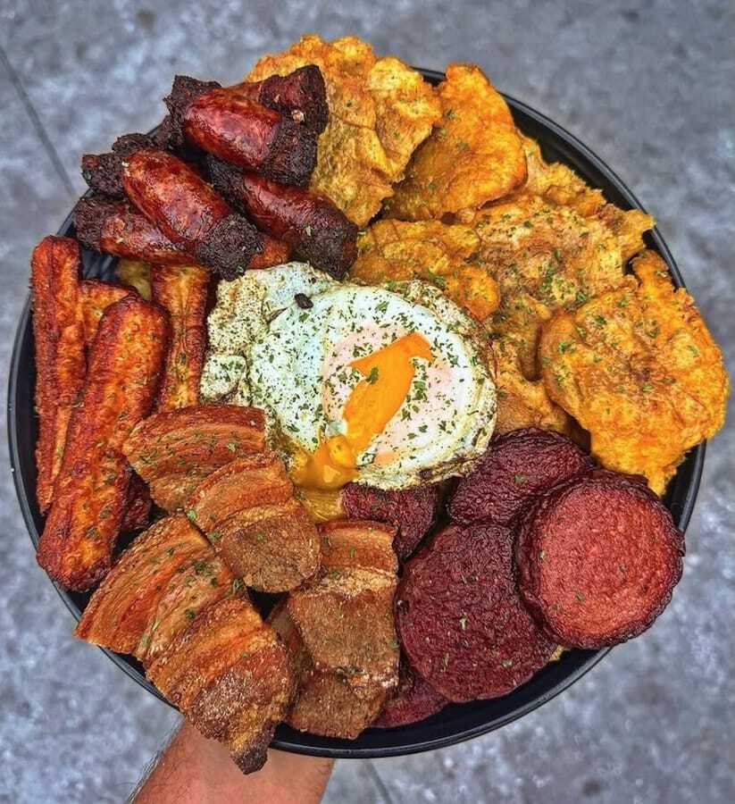 The namesake tres golpes, mangu piled with fried salami, cheese, and egg, shares the spotlight with wild creations like plantain-crust pizza.